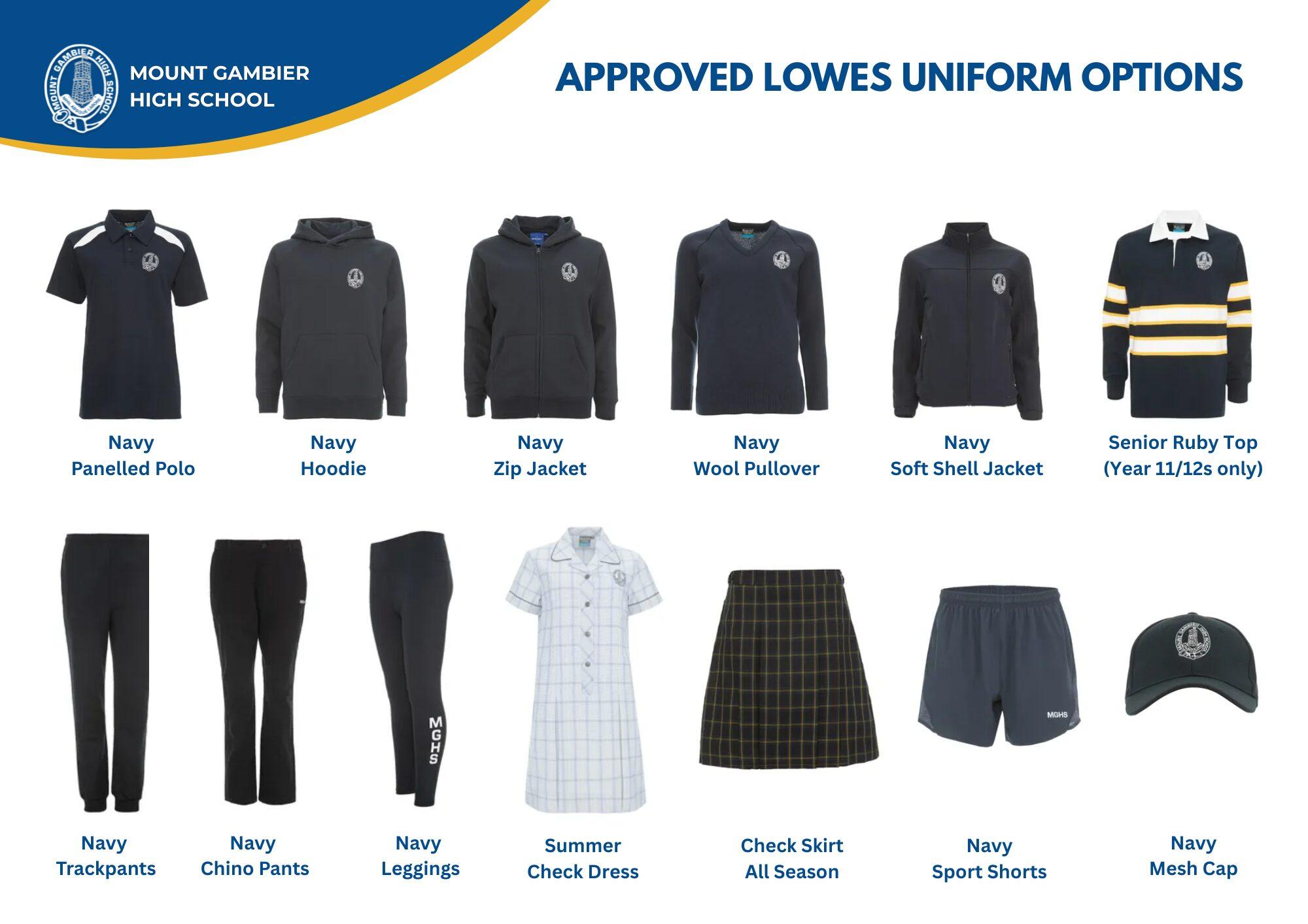 The full range of the exclusive Mount Gambier High School uniform can be purchased through Lowes Australia, either online or in-store at the Mount Gambier Marketplace. Lowes offers great purchasing options, including multiple 20% off days throughout the year, a rewards card, and the Zero Card (take-home layby). Please speak with the friendly staff in store for further information.